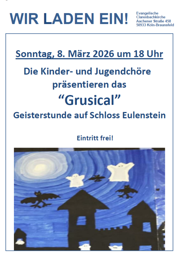 HWB Ein „Grusical“ am Sonntag, 08. März 2026, um 18.00 Uhr in der Clarenbachkirche Die Kinder- und Jugendchöre präsentieren eine Geisterstunde auf Schloss Eulenstein