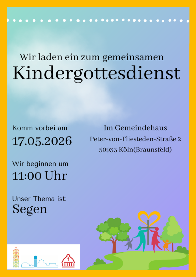 Startseite > Aktuelles > Gemeinsamer Kindergottesdienst am Sonntag, 17. Mai 2026, um 11.00 Uhr im Gemeindehaus in Braunsfeld, Peter-von-Fliesteden-Str. 2
