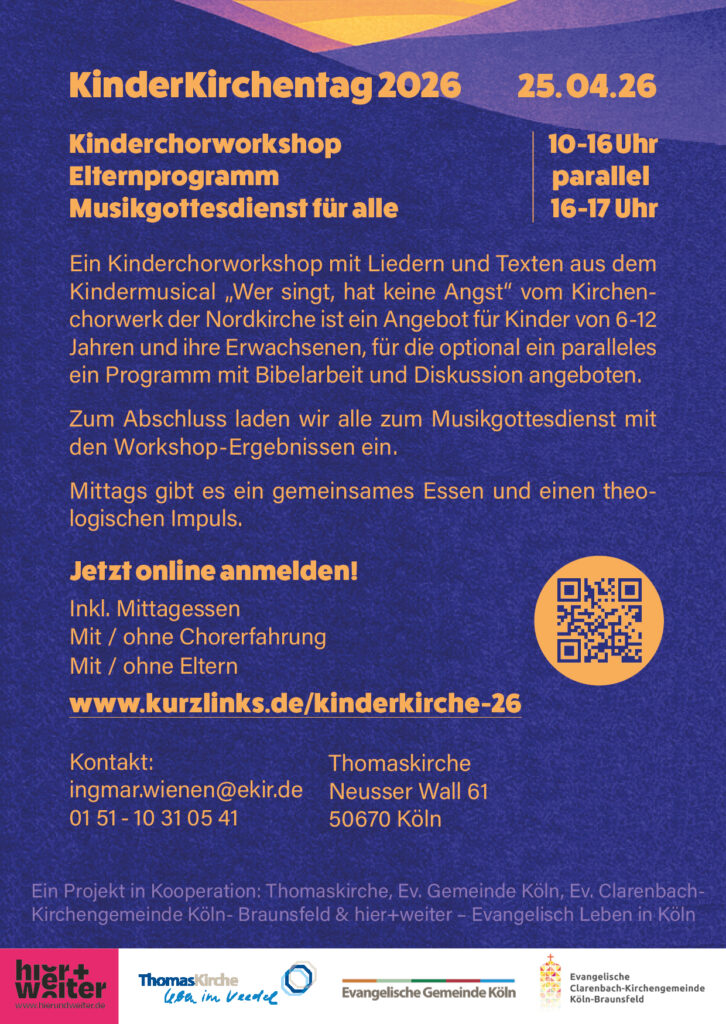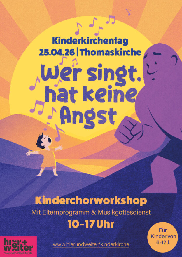 Kinderkirchentag am 25. April 2026 in der Thomaskirche, Neusser Wall 61 Wer singt, hat keine Angst Weitere Informationen unter http://www.hierundweiter.de