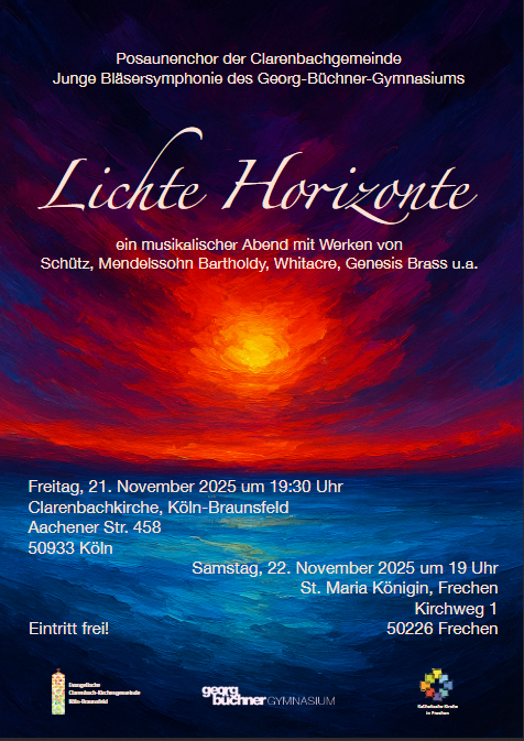 Startseite > Aktuelles > Posaunenchorkonzert unserer Gemeinde zusammen mit der Jungen Bläsersymphonie des Georg-Büchner-Gymnasiums am Freitag, 21. November 2025, um 19.30 Uhr in der Clarenbachkirche