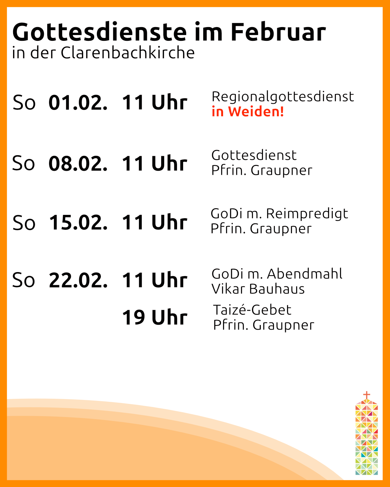 Keine Veranstaltung11:00 - 12:00 | Ort: ClarenbachkircheGottesdienst mit Reimpredigt
