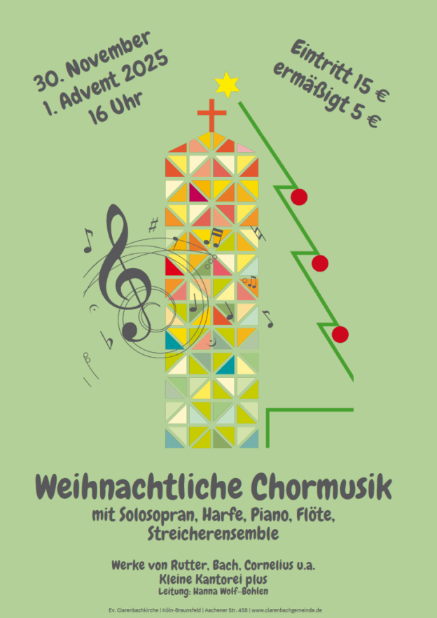 Weihnachtliche Chormusik am 30. November 2025 um 16.00 Uhr in der Clarenbachkirche, Vorverkauf hat begonnen! Werke von Rutter, Bach, Cornelius u.a.