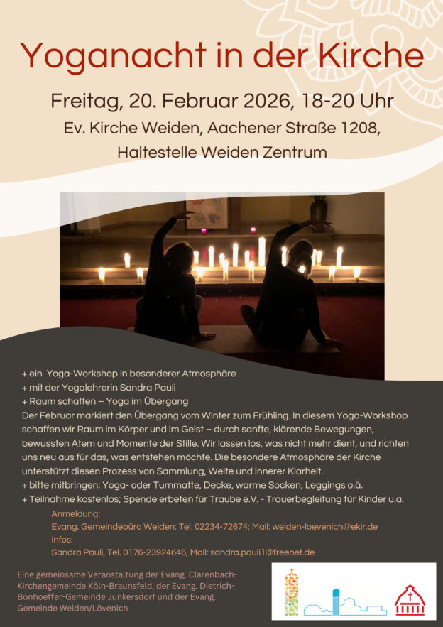 UG Yoganacht in der Kirche am Freitag, 20. Februar 2026, 18.00 – 20.00 Uhr, in der Ev. Kirche Weiden Anmeldung bitte im Ev. Gemeindebüro Weiden